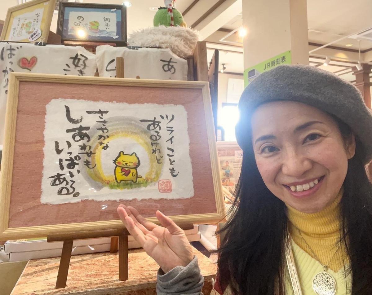 イラストに短い言葉を添えた作品「絵ことば」の展示・販売が現在、普陀山妙法寺(近江八幡市鉄炮町)で行われている。